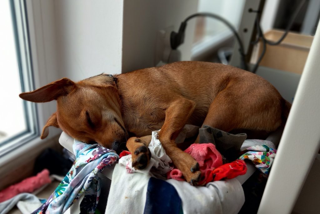 Nad procesem produkcji czuwa mój asystent. Zwykle dba o to, żebym robiła sobie przerwy. Czasem pogryzie szpulkę nici, ale o tym ciiiiiii… To się wytnie. Staram się, żeby nie zostawiał po sobie śladów, ale jak się czasem trafi jakiś kłaczek to sorka. To niechcący.